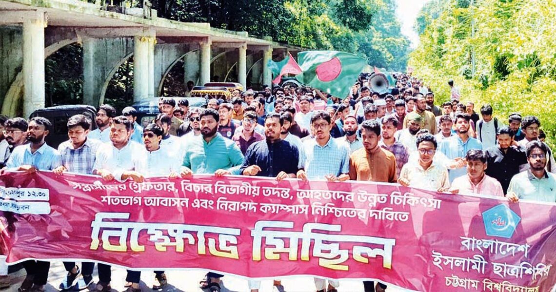 চট্টগ্রাম বিশ্ববিদ্যালয়ে (চবি) ছাত্রশিবিরের পক্ষ থেকে অপরাধীদের গ্রেপ্তার, বিচার বিভাগীয় তদন্ত, আহতদের উন্নত চিকিৎসা ও শতভাগ আবাসন ও নিরাপদ ক্যাম্পাসের দাবিতে ব্যাপক বিক্ষোভ ও মিছিল অনুষ্ঠিত হয়েছে। সোমবার দুপুর সাড়ে ১২টার দিকে বিশ্ববিদ্যালয়ের চাকসু ভবনের সামনে থেকে শুরু হয়ে মিছিলটি প্রচণ্ড স্লোগান দিয়ে প্রশাসনিক ভবন, শহীদ মিনার এবং কাটা পাহাড় রোড পেরিয়ে জিরো পয়েন্টে এক সংক্ষিপ্ত সমাবেশে শেষ হয়।