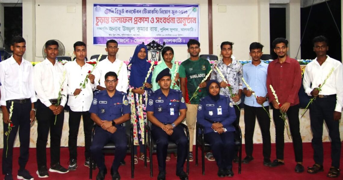 ঝালকাঠিতে ‘সেবার ব্রতে চাকরি’ এই স্লোগানে অনুষ্ঠিত হওয়া বাংলাদেশ পুলিশ ট্রেইনি রিক্রুট কনস্টেবল (টিআরসি) পরীক্ষার ফলাফল ঘোষণা করা হয়েছে। বিশ্ববিদ্যালয়, যোগ্যতা ও স্বচ্ছতার ভিত্তিতে নির্বাচিত হওয়া এই নতুন পুলিশ সদস্যরা জুন ২০২৫ সালের নিয়োগ পরীক্ষায় উত্তীর্ণ হয়েছে। নিয়োগ বোর্ডের সদস্য এবং ঝালকাঠি জেলা পুলিশের বিভিন্ন পর্যায়ের কর্মকর্তারা উপস্থিত ছিলেন এই ফলাফল ঘোষণা অনুষ্ঠানে।