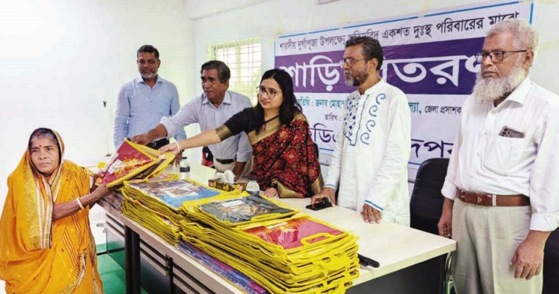 শারদীয় দুর্গোৎসবের পবিত্র আনন্দ ও উৎসাহে মেতে উঠেছে ফরিদপুর। এই আবেগময় সময়ের প্রাক্কালে, ফরিদপুর ডেভেলপমেন্ট এজেন্সি (এফডিএ) হতদরিদ্র ও সনাতন ধর্মাবলম্বী পরিবারের জন্য এক বিশেষ উপহার হিসেবে শাড়ি বিতরণ করেছে। বৃহস্পতিবার সকালে ফরিদপুরের সদর উপজেলার টেপুরাকান্দী এলাকায় এফডিএর কার্যালয়ে এই অনুষ্ঠানের আয়োজন করা হয়। বেসরকারি এই উন্নয়ন সংস্থাটি নিজস্ব তহবিল থেকে এই শাড়ি বিতরণের মাধ্যমে সামর্থ্যহীন মানুষগুলোর মধ্যে কিছুটা আনন্দ ও উচ্ছ্বাস ছড়ানোর চেষ্টা করেছে। এফডিএর প্রধান কার্যালয়ে অনুষ্ঠিত এই শুভ অনুষ্ঠানে প্রধান অতিথি হিসেবে উপস্থিত ছিলেন ফরিদপুরের অতিরিক্ত জেলা প্রশাসক (শিক্ষা ও আইসিটি), সুশ্রী মুখ, সুস্মিতা সাহা। এফডিএর নির্বাহী পরিচালক আবু ছাহের আলমের সভাপতিত্বে অনুষ্ঠানে আরও ছিলেন প্রতিষ্ঠাতা মো. আজহারুল ইসলাম, বিশিষ্ট এনজিও ব্যক্তিত্ব, পাশাপাশি ফরিদপুর প্রেসক্লাবের সাধারণ সম্পাদক মাহাবুব হোসেন পিয়াল। পরে, এই বিশেষ দিনটি আরও অর্থবহ করে তুলতে, শতাধিক হতদরিদ্র হরিজন সম্প্রদায় ও সনাতন ধর্মাবলম্বীদের মাঝে শাড়ি বিতরণ করা হয়, যা সাম্প্রদায়িক সম্প্রীতি ও মানবতার পরিচায়ক হয়ে উঠেছে। সকলের কাছে এই উদ্যোগটি এক সুন্দর বার্তা—একসাথে সামাজিক সম্প্রীতি ও মানুষের কল্যাণের পথে এগিয়ে যাওয়ার।