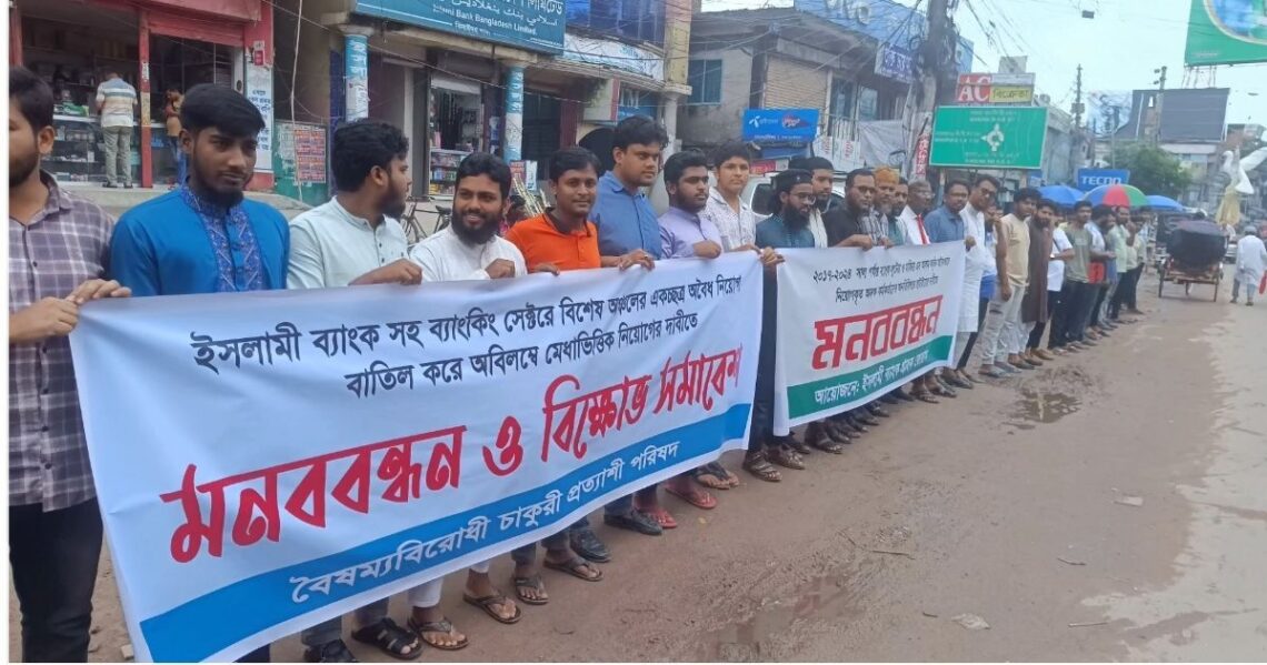 ঝিনাইদহে ব্যাংকিং সেক্টরে অবৈধ নিয়োগ বন্ধ ও মেধার ভিত্তিতে নিয়োগের দাবীতে একটি মানববন্ধন কর্মসূচি অনুষ্ঠিত হয়েছে। এই কর্মসূচী অনুষ্ঠিত হয় সোমবার সকালে, যেখানে ইসলামী ব্যাংক ঝিনাইদহ শাখার সামনে বিশিষ্ট গ্রাহক ও চাকরিপ্রার্থীরা অংশ নেন। সকলেই বিভিন্ন ব্যানার ও ফেস্টুন নিয়ে উপস্থিত হন। ঘন্টাব্যাপী এই আন্দোলনে অংশ নেন ব্যাংকের গ্রাহক আল মাহমুদ, হাদি মহম্মদ, জিয়াউল ইসলাম খান, কাজী রফিকুল ইসলাম, আব্দুল্লাহ আল মামুন, আব্দুল কুদ্দুস, আব্দুস সবুরসহ আরও অনেকেই। বক্তারা অভিযোগ করেন, ২০১৭ সাল থেকে ২০২৪ সাল পর্যন্ত ইসলামী ব্যাংকে অ্যাাস আলমের মাধ্যমে অবৈধভাবে হাজারো কর্মী নিয়োগ করা হয়েছে। এ ছাড়াও, ব্যাংকের বিপুল পরিমাণ অর্থ অবৈধভাবে বিদেশে পাচার করা হয়েছে। বক্তারা দ্রুত সময়ের মধ্যে অবৈধ নিয়োগ বন্ধ করে, মেধাবী প্রার্থীদের ভিত্তিতে নিয়োগের দাবি করেন।