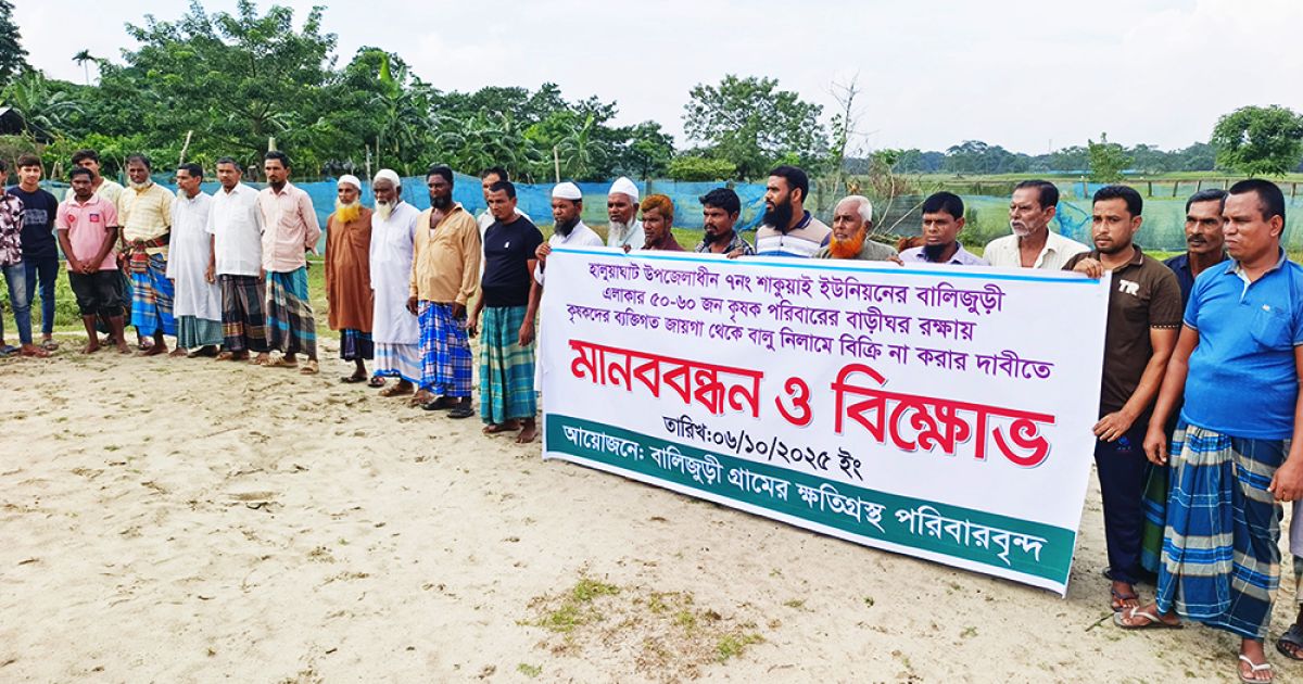 ময়মনসিংহের হালুয়াঘাট উপজেলার শাকুয়াই ইউনিয়নের বালিজোড়ি এলাকার অর্ধশতাধিক কৃষক পরিবার তাদের বাড়িঘর রক্ষায় ব্যক্তিগত জমিতে থেকে নেওয়া বালের নিলাম প্রত্যাহারের দাবিতে মানববন্ধন ও বিক্ষোভ মিছিল করেছেন। এই ঘটনাটি ঘটে সোমবার দুপুরে বালিজোড়ি গ্রামের একটি স্থানীয় সমাবেশে, যেখানে শতাধিক মানুষ অংশগ্রহণ করেন।
