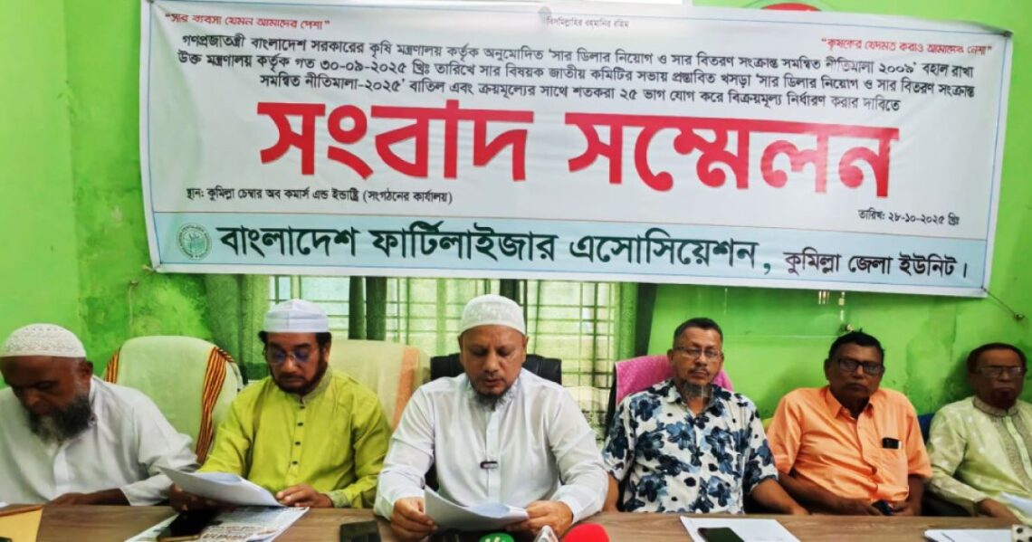 কুমিল্লা, ২৮ অক্টোবর: বাংলাদেশ ফার্টিলাইজার এসোসিয়েশন (বিএফএ) কুমিল্লা জেলা ইউনিট শক্তভাবে দাবি জানিয়েছে যে, সার সরবরাহে স্থিতিশীলতা বজায় রাখতে এবং কৃষকদের সময়মতো সার পৌঁছে দিতে বর্তমানে প্রস্তাবিত ‘সার ডিলার নিয়োগ ও সার বিতরণ সংক্রান্ত সমন্বিত নীতিমালা-২০২৫’ বাতিল করতে হবে। তারা বলেন, এই নতুন নীতিমালা কার্যকর হলে কৃষি উৎপাদন মারাত্মকভাবে ক্ষতিগ্রস্ত হবে এবং সার সরবরাহে বড় ধরনের বিপর্যয় ডেকে আসবে। বরং তারা ২০০৯ সালের পুরনো নীতিমালা কার্যকর রাখার পক্ষে একমত। একই সঙ্গে, কৃষকদের সুবিধার জন্য বিক্রয় মূল্যে পরিবহন, অন্যান্য খরচ ও লাভের জন্য শতকরা ২৫% বৃদ্ধি করে বিক্রিয়া নির্ধারণের দাবি দেখিয়েছেন সংগঠনটি।