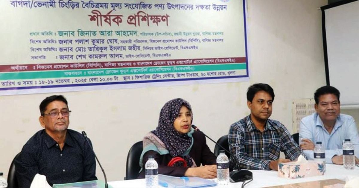 রপ্তানি উন্নয়ন ব্যুরোর (ইপিবি) পরিচালক (উপসচিব) জিনাত আরা আহমেদ বলেছেন, যদি সরকারি সহায়তা বৃদ্ধি পায় এবং বর্তমান প্রতিবন্ধকতাগুলো কাটিয়ে উঠা যায়, তাহলে বাংলাদেশের চিংড়ি খাত আগামী বছরগুলোতে ৫ বিলিয়ন ডলার বৈদেশিক মুদ্রা উপার্জন করতে সক্ষম হবে। মঙ্গলবার খুলনা শহরের ফিশারিজ ট্রেনিং শ্রিম্প টাওয়াররে আয়োজিত ‘বাগদা ও ভেনামি চিংড়ি থেকে বৈচিত্র্যময় মূল্য সংযোজন পণ্য উৎপাদন’ বিষয়ক একটি প্রশিক্ষণ কর্মশালার উদ্বোধনী অনুষ্ঠানে প্রধান অতিথির বক্তৃতায় তিনি এই আশাবাদ ব্যক্ত করেন। এই অনুষ্ঠানে রপ্তানি প্রবৃদ্ধি বাড়ানো ও চিংড়ি খাত থেকে বেশি আয় করার জন্য প্রয়োজনীয় দক্ষতা ও প্রযুক্তির উন্নয়নের ওপর গুরুত্ব আরোপ করা হয়। জিনাত আরা আহমেদ আরও জানান, সরকার সম্প্রতি ভেনামি চিংড়ি চাষের জন্য অনুমোদন দিয়েছে, যা আগে অনেক দীর্ঘ সময় ধরে বিলম্বিত ছিল। তিনি বলেন, যেখানে বাগদা চিংড়ির এক হেক্টরে উৎপাদন গড়ে ৫০০ কেজি, সেখানে ভেনামি চাষে প্রতি হেক্টরে ১৫,০০০ কেজি পর্যন্ত উৎপাদন সম্ভব। এই প্রশিক্ষণ কর্মশালায় সভাপতিত্ব করেন বাংলাদেশ ফ্রোজেন ফুডস এক্সপোর্টার্স অ্যাসোসিয়েশনের (বিএফএফইএ) সহ-সভাপতি শেখ কামরুল আলম, এবং এতে বিশেষ অতিথি হিসেবে উপস্থিত ছিলেন বিজনেস প্রোমোশন কাউন্সিলের (বিপিসি) সহকারী পরিচালক পলাশ কুমার ঘোষ। উদ্বোধনী অধিবেশনে প্রধান অতিথি বলেন, চিংড়ি ও মাছের খাত বাংলাদেশের দক্ষিণাঞ্চলের অন্যতম প্রধান রপ্তানিমুখী শিল্প এবং দেশের অর্থনীতিতে এর গুরুত্বপূর্ণ অবদান রয়েছে। তিনি আশ্বাস দেন, ইপিবি চিংড়ি খাতের উন্নয়ন ও রপ্তানি বৃদ্ধির জন্য সব ধরনের সহযোগিতা অব্যাহত রাখবে। সভায় বলা হয়, এখন বিশ্বের প্রায় ৫০ লাখের বেশি মানুষ এই শিল্পে জড়িত, যার মধ্যে বেশিরভাগই নারী। একসময় চিংড়ি ছিল বাংলাদেশের দ্বিতীয় বৃহত্তম রপ্তানি খাত, কিন্তু উচ্চ ফসলের ভেনামি চাষের অনুমোদনের বিলম্ব এবং প্রশাসনিক জটিলতার কারণে উৎপাদন অনেকটা পিছিয়ে গেছে। তবে ভারতের তুলনায় বাংলাদেশের চাষের সম্ভাবনা এখনও উল্লেখযোগ্য। এই প্রশিক্ষণে খুলনা, সাতক্ষীরা, বাগেরহাটের হিমায়িত মাছ প্রক্রিয়াজাতকরণ কারখানার কর্মকর্তা, খুলনা বিশ্ববিদ্যালয়ের শিক্ষার্থী, হ্যাচারি কর্মী, সাংবাদিকসহ বিভিন্ন অংশগ্রহণকারী অংশ নেন।