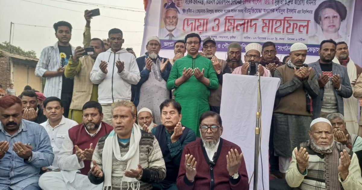 বিএনপি চেয়ারপার্সন ও সাবেক প্রধানমন্ত্রী বেগম খালেদা জিয়ার সুস্থতা ও দীর্ঘ জীবন কামনায় ভেড়ামারা উপজেলায় ঐক্যবদ্ধভাবে দোয়া মাহফিল অনুষ্ঠিত হয়েছে। রবিবার (৭ ডিসেম্বর) বিকালে উপজেলা বিএনপির আয়োজনে এই ধর্মীয় ও রাজনৈতিক অনুষ্ঠানে বিভিন্ন শ্রেণীপেশার মানুষ অংশগ্রহণ করেন।