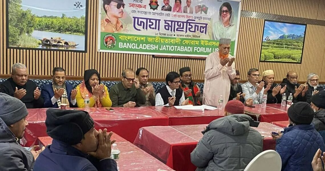 বিএনপি চেয়ারপারসন ও সাবেক প্রধানমন্ত্রী বেগম খালেদা জিয়ার দ্রুত সুস্থতা ও স্বাস্থ্যের জন্য প্রার্থনা জানাতে নিউইয়র্কে অনুষ্ঠিত হলো দোয়া মাহফিল ও আলোচনা সভা। যুক্তরাষ্ট্রের নিউইয়র্কে বাংলাদেশ জাতীয়তাবাদী ফোরাম ইউএসএ ইনক-এর উদ্যোগে গত সোমবার জ্যাকসন হাইটসের নবান্ন রেস্টুরেন্টে এই আয়োজন করা হয়। অনুষ্ঠানে সভাপতিত্ব করেন ফোরামের সভাপতি মাহবুবুর রহমান মুকুল এবং সঞ্চালনা করেন সাধারণ সম্পাদক মোহাম্মদ আবদুল মান্নান হোসাইনে। অনুষ্ঠানটি শুরু হয় পবিত্র কোরআন তিলাওয়াত দিয়ে, এরপর অনুষ্ঠিত হয় বিশেষ মোনাজাত। এই মোনাজাতে শহীদ প্রেসিডেন্ট জিয়াউর রহমান, আরাফাত রহমান কোকো, শরিফ ওসমান হাদি সহ মুক্তিযুদ্ধে শহীদদের রুহের মাগফিরাত কামনা করা হয় এবং খালেদা জিয়ার দ্রুত সুস্থতার জন্য মহান আল্লাহর কাছে দোয়া করা হয়। আলোচনা সভায় বক্তারা দেশের স্থিতিশীলতা ও জনগণের স্বার্থে ভবিষ্যতের নির্বাচনকে ঘিরে বললেন, দলীয় নেতা-কর্মীদের জিয়া আদর্শে অনুপ্রাণিত হয়ে নৈতিকতা ও ঐক্য বজায় রাখতে হবে। তারা আরও উল্লেখ করেন, নোংরা রাজনীতি থেকে দূরে থেকে গণতান্ত্রিক মূল্যবোধকে সামনে এনে, বিএনপিকে শক্তিশালী ও সুসংগঠিত করার ওপর গুরুত্বারোপ করেন। এতে তারা আরও বলেন, ভারত ও আওয়ামী লীগকে সমালোচনা করে বলিষ্ঠ রাজনৈতিক প্রতিদ্বন্দ্বিতা করে স্বাধীন ও স্বনির্ভর বাংলাদেশ গড়ে তোলার অঙ্গীকার ব্যক্ত করা হয়েছে।
