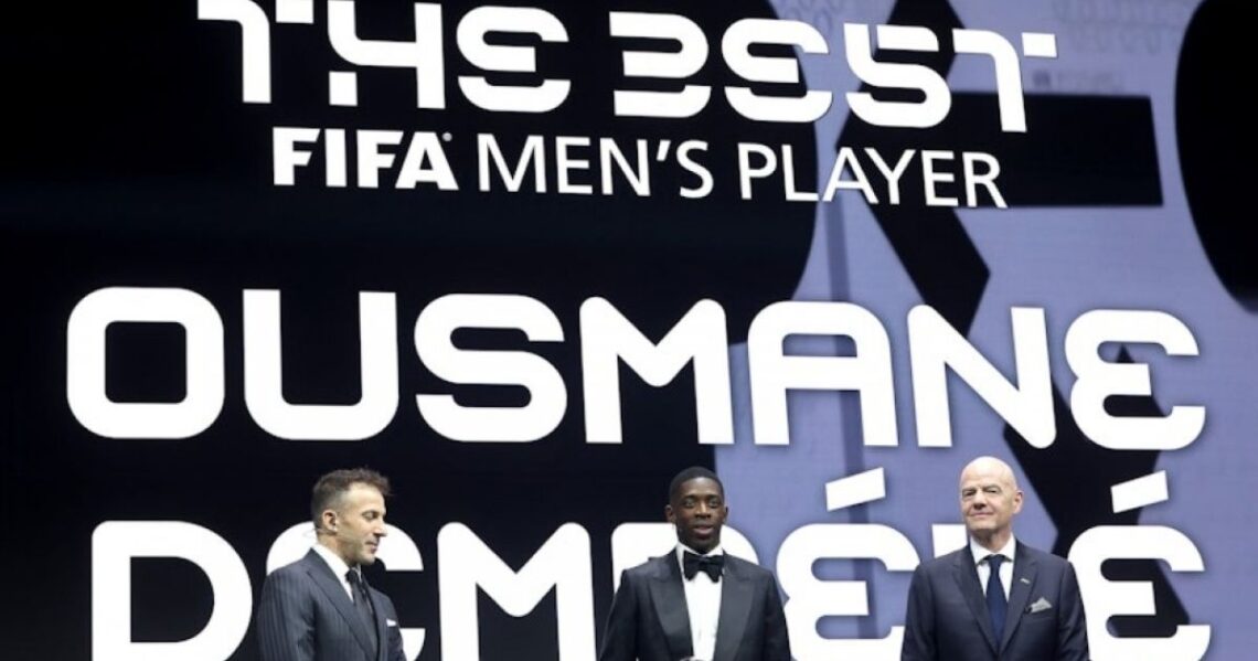 গত সেপ্টেম্বরের ব্যালন ডি’অর জয় করার পর এবার ফিফার বর্ষসেরা ফুটবলার হিসেবে ‘দ্য বেস্ট’ পুরস্কারও নিজেদের করে নিলেন প্যারিস সেন্ট-জার্মেই (পিএসজি) ও ফ্রান্সের তারকা ফরোয়ার্ড উসমান দেম্বেলে। মঙ্গলবার কাতার দ্বিতীয় রাজধানী দোহায় অনুষ্ঠিত এক জমকালো অনুষ্ঠানে, যেখানে ফিফা সভাপতি জিয়ান্নি ইনফান্তিনোসহ প্রায় ৮০০ অতিথি উপস্থিত ছিলেন, তাকে এই স্বীকৃতি দেওয়া হয়। একই অনুষ্ঠানে নারীবিশ্বে ফিফা দ্য বেস্ট নির্বাচিত হন বার্সেলোনার স্প্যানিশ মিডফিল্ডার আইতানা বোনমাতি।