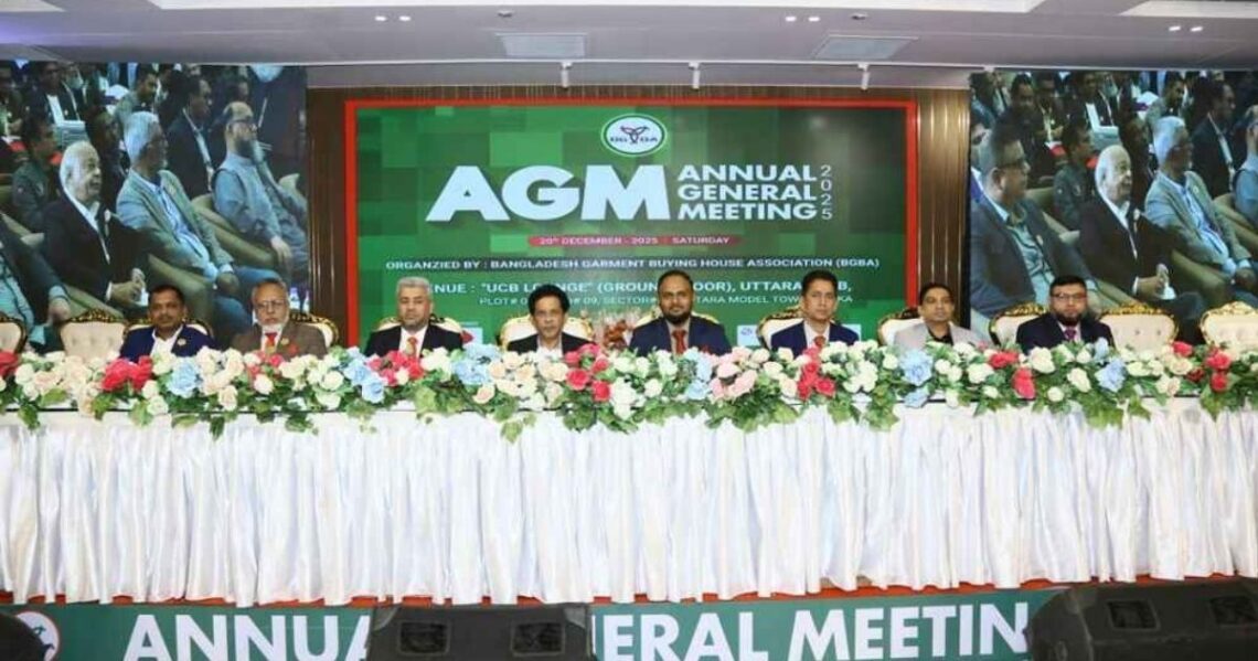 বাংলাদেশ গার্মেন্ট বায়িং হাউজ অ্যাসোসিয়েশনের (বিজিবিএ) বার্ষিক সাধারণ সভা (এজিএম) গত শনিবার (২০ ডিসেম্বর) রাতে রাজধানীর উত্তরা ক্লাবে অনুষ্ঠিত হয়েছে। এতে সংগঠনের সদস্যরা উপস্থিত ছিলেন। অনুষ্ঠানটি উপস্থিত ছিলেন বিজিবিএর প্রতিষ্ঠাতা প্রেসিডেন্ট কাইয়ুম রেজা চৌধুরী, বস্ত্র অধিদপ্তরের মহাপরিচালক মো. শহীদুল ইসলাম, জাতীয় রাজস্ব বোর্ডের প্রথম সচিব শাহরিয়ার হাসান এবং ইউনাইটেড করমাশিয়াল ব্যাংক পিএলসির এএমডি আদনান মাসুদ। এই সভার শুরুতে ইনকিলাব মঞ্চের মুখপত্র শরিফ ওসমান হাদির আকস্মিক মৃত্যুর শোক প্রকাশ করে এক মিনিট নীরবতা পালন করা হয়, এরপর তার আত্মার শান্তির জন্য মোনাজাত অনুষ্ঠিত হয়। মোনাজাত পরিচালনা করেন বিজিবিএর ট্রেজারার ফজলুল হক সাঈদ। সভার সূচনায় সঞ্চালকের দায়িত্ব পালন করেন এ এইচ এম সালেহ উজ্জামান। এ সময় প্রতিষ্ঠাতা প্রেসিডেন্ট কাইয়ুম রেজা চৌধুরী তার প্রারম্ভিক বক্তব্য দেন। সাধারণ সম্পাদক মো. জাকির হোসেন বিগত বছরগুলোতে সংগঠনের গৃহীত ও বাস্তবায়িত কার্যক্রমের উপর বক্তব্য রাখেন, পাশাপাশি ট্রেজারার ফজলুল হক সাঈদ অর্থবছর ২০২৪-২৫ এর বাজেট ও অডিট রিপোর্ট উপস্থাপন করেন। আলোচনার শেষে প্রশ্নোত্তর পর্ব শুরু হয় যেখানে উপস্থিত সদস্যরা বিভিন্ন বিষয়ে প্রশ্ন করেন এবং বিজিবিএর সার্বিক উন্নয়নের জন্য শুভেচ্ছা ও সুপারিশ উপস্থাপন করেন। পুরো অনুষ্ঠানে সংগঠনের ভবিষ্যৎ উন্নয়নে বিভিন্ন দিক থেকে আলোচনার সুযোগ দেখা যায়।
