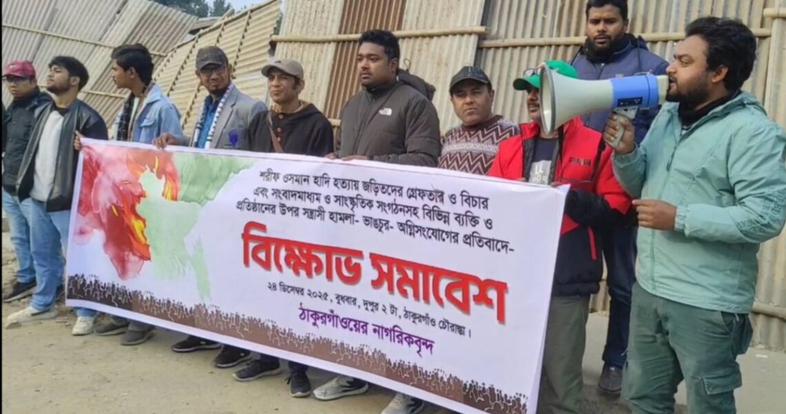 বিশেষ করে বুধবার (২৪ ডিসেম্বর) বিকাল তিনটার দিকে শহর চৌরাস্তায় ঠাকুরগাঁও নাগরিক বৃন্দের উদ্যোগে এক বিবৃতি ও প্রতিবাদ সভা অনুষ্ঠিত হয়। এতে বিভিন্ন পেশার মানুষ, যেমন- রাজনীতিবিদ, ছাত্র-শিক্ষক, শ্রমিক, কৃষক, সাংস্কৃতিক কর্মী ও মানবাধিকার পর্যবেক্ষকরা অংশগ্রহণ করেন।