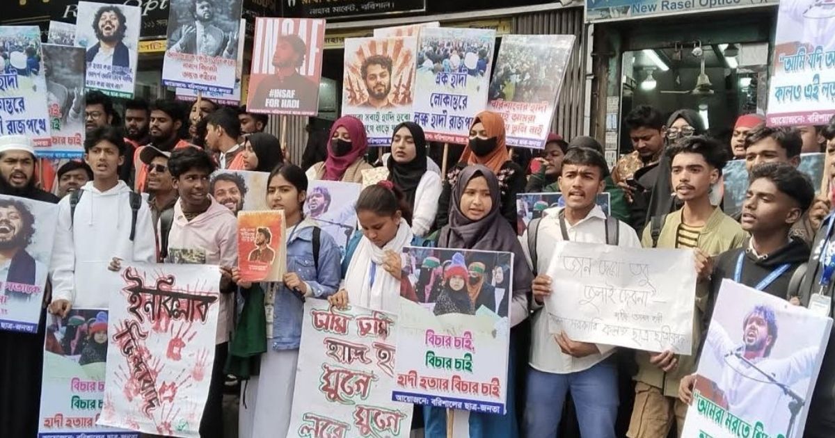 ইনকিলাব মঞ্চের আহ্বায়ক শরীফ ওসমান হাদির হত্যাকারীদের দ্রুত গ্রেপ্তার করে কঠোর শাস্তির দাবিতে বরিশালে ব্যাপক গণমিছিল ও প্রতিবাদ সমাবেশ অনুষ্ঠিত হয়েছে। সোমবার (৫ জানুয়ারি) দুপুরের দিকে নগরীর সদর রোডের টাউন হল থেকে ছাত্রজনতার আয়োজনে এই প্রতিবাদ মিছিল শুরু হয়। মিছিলটি নগরীর বিভিন্ন গুরুত্বপূর্ণ সড়ক প্রদক্ষিণ করে শেষে নথুল্লাবাদ কেন্দ্রীয় বাস টার্মিনালের কাছে এসে শেষ হয়। এর আগে, অশ্বিনী কুমার টাউন হলের সামনে অনুষ্ঠিত সংক্ষিপ্ত সমাবেশে বক্তারা ভারতের আধিপত্যবাদ বিরোধী আন্দোলনের অন্যতম সেনানী শহীদ ওসমান হাদির হত্যাকাণ্ডের বিচারের ওপর গুরুত্বারোপ করেন। বক্তারা জানান, দ্রুততম সময়ে হাদির হত্যাকারীদের গ্রেপ্তার ও দৃষ্টান্তমূলক শাস্তি না হলে কঠোর আন্দোলনের হুঁশিয়ারি দেওয়া হয়। বক্তারা বলেন, শহীদ ওসমান হাদি ছিলেন ভারতীয় আধিপত্যবাদের বিরুদ্ধে লড়াইয়ে অগ্রসেনানী। তার নির্মম হত্যার বিন্দুব্রহ্মেরও নজরদারি না থাকায় তারা উদ্বেগ প্রকাশ করেন। এ ছাড়াও, বক্তারা উল্লেখ করেন, বাংলাদেশের স্বাধীনতার জন্য লড়াইয়ে যেমন মুক্তিযোদ্ধারা আত্মত্যাগ করেছে, সেই পথেই চলতে হবে, অন্যথায় একই ধরনের ন্যায়বিচার থেকে বঞ্চিত হবে দেশের একজন একনিষ্ঠ নেতা। তারা নিশ্চিত করে বলেন, বর্তমান সরকারের মেয়াদ শেষ হওয়ার আগেই হাদির হত্যার সুবিচার সম্পন্ন করতে হবে। তা না হলে, এই ধরনের প্রতিবাদ ও আন্দোলন আরও জোরদার করার আহ্বান জানান।