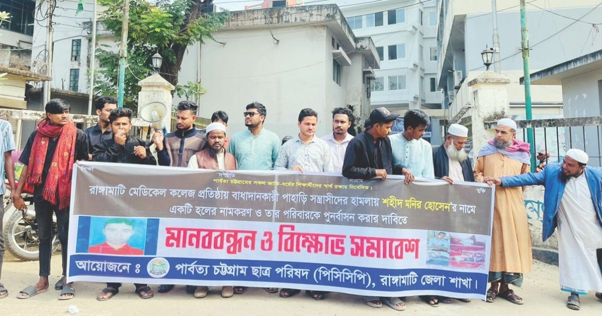 রাঙামাটি মেডিকেল কলেজে শহীদ মনির হোসেনের স্মৃতি স্মরণে একটি হলের নামকরণ এবং তার পরিবারের পুনর্বাসন ও সরকারি চাকরির দাবি নিয়ে মানববন্ধন ও বিক্ষোভ সমাবেশ অনুষ্ঠিত হয়েছে পার্বত্য চট্টগ্রাম ছাত্র পরিষদ (পিসিসিপি) এর আহ্বানে। এই পদক্ষেপটি রোববার (১১ জানুয়ারি) সকালে কলেজের গেটের সামনে অনুষ্ঠিত হয়।