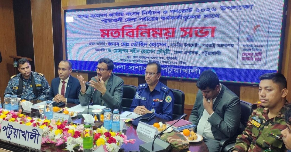 পটুয়াখালীর জেলা প্রশাসক ড. মোহাম্মদ শহীদ হোসেন চৌধুরীর সভাপতিত্বে অনুষ্ঠিত এই গুরুত্বপূর্ণ সভায় উপস্থিত ছিলেন জেলা পুলিশ সুপার মো. আবু ইউসুফ, স্থানীয় সরকার বিভাগ বিভাগের উপ-পরিচালক জুয়েল রানা, অতিরিক্ত জেলা ম্যাজিস্ট্রেট তারেক হাওলাদারসহ বিভিন্ন সরকারি দপ্তরের কর্মকর্তারা। সভায় নির্বাচনের প্রশাসনিক প্রস্তুতি, আইনশৃঙ্খলা রক্ষা, ভোট কেন্দ্রের নিরাপত্তা এবং ভোটার উপস্থিতি বাড়ানোর কৌশল নিয়ে বিস্তারিত আলোচনা হয়। বক্তারা একাত্মে অভিমত ব্যক্ত করেন যে, সবাই মিলে সমন্বিতভাবে কাজ করলে একটি শান্তিপূর্ণ, উৎসবমুখর ও সফল নির্বাচন সম্পন্ন করা সম্ভব।