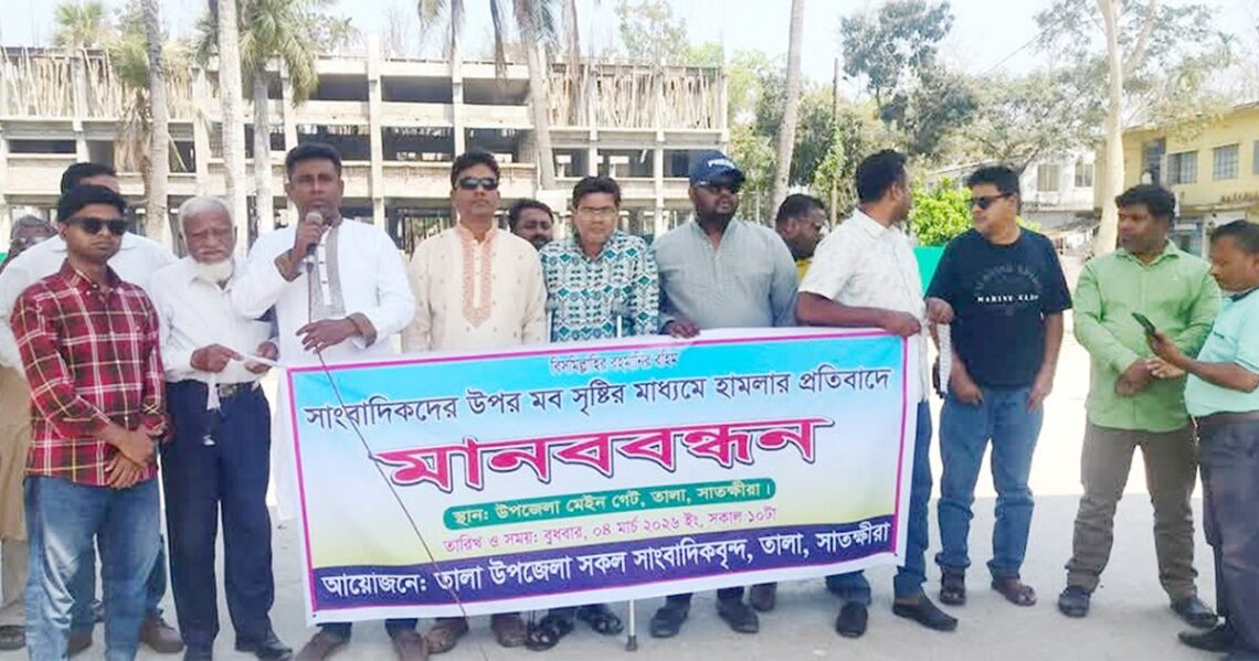 সাতক্ষীরায় সোমবার (৪ মার্চ) তালা উপজেলা প্রশাসন কার্যালয় প্রাঙ্গণে তালায় কর্মরত সাংবাদিকদের বিভিন্ন ইউনিটের যৌথ উদ্যোগে মানববন্ধন অনুষ্ঠিত হয়েছে। ওই সময়ে সাংবাদিকরা সাম্প্রতিক মব-আক্ৰমণ ও সাংবাদিকদের নির্যাতনের বিরুদ্ধে কঠোর নিন্দা জানিয়ে দোষীদের সুষ্ঠু বিচারের দাবি করেন।