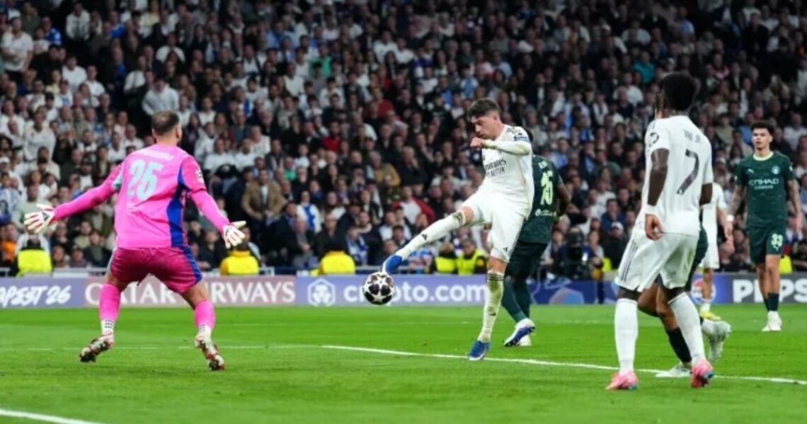 সান্তিয়াগো বার্নাব্যুতে এক দাপুটে পারফরম্যান্সে ম্যানচেস্টার সিটিকে ৩-০ গোলে হারিয়ে কোয়ার্টার ফাইনালের পথে বড় পদক্ষেপ নিলো রিয়াল মাদ্রিদ। অধিনায়ক ফেদরিকো ভালভার্দের ঝড়ো হ্যাটট্রিকে আলভারো আরবেলোয়ার শিষ্যরা দর্শকপ্রিয় ফুটবল আর দৃঢ় রক্ষণভাগের সুবাদে ম্যাচে প্রভূত নিয়ন্ত্রণ দেখালো।