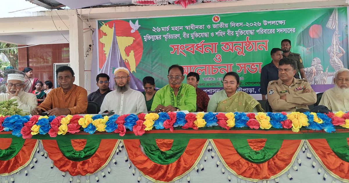 মহান স্বাধীনতা ও জাতীয় দিবস ২০২৬ উপলক্ষে গোপালগঞ্জের কোটালীপাড়া উপজেলা প্রশাসনের আয়োজনে বীর মুক্তিযোদ্ধা ও শহীদ মুক্তিযোদ্ধা পরিবারের সদস্যদের সংবর্ধনা ও আলোচনা সভা অনুষ্ঠিত হয়েছে।