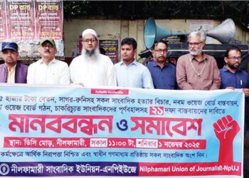 নীলফামারীতে বৃষ্টিপাত উপেক্ষা করে সাংবাদিকেরা মঙ্গলবার মানববন্ধন ও সমাবেশের মাধ্যমে তাদের ২১ দফা দাবি পূরণের জন্য রাস্তায় নেমেছেন। এই দাবি...
